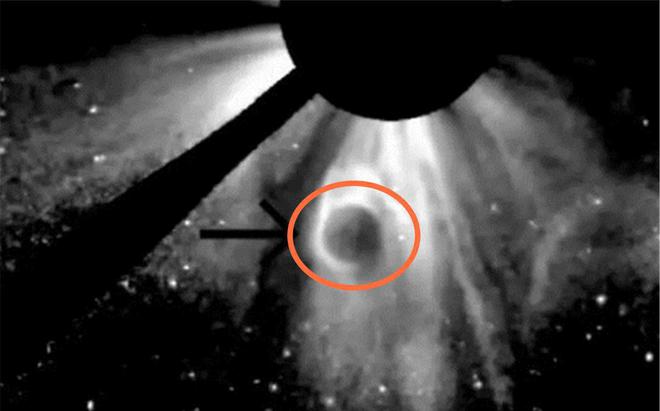 網上對這張照片的分析不少。這張照片是太陽觀測衞星SOHO拍攝的,上面那個半圓形的黑影遮擋的就是太陽,中間紅圈裏的就是巨型UFO。大體來説,首先,這個巨型UFO不是日珥,它肯定是個球體,因為它的邊緣堆積了不少被阻擋回來的太陽風,顯得特別明亮;其次,它不發光也不反射光,完全是個暗黑天體,因此筆者暫且稱呼它為“黑體星”;在這麼近的距離遭受太陽風的猛烈衝擊卻基本沒有變形,證明黑體星外殼極其堅固耐熱;有部分太陽風彌散到黑體星前部,證明它和地球的距離與日地距離差不多,據此推算,它的直徑相當於三分之一到一半的太陽直徑,其體積遠大於地球。