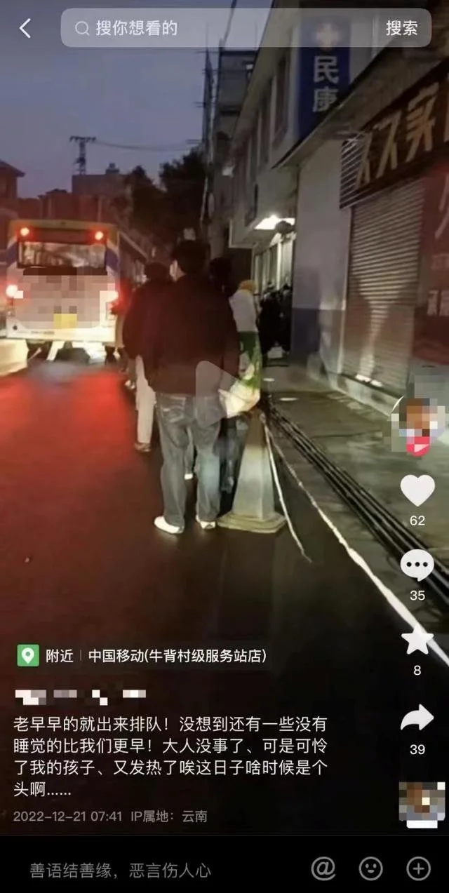 據周雨觀察,雲南老家村子裏很多人即使出現發燒咳嗽等症狀,也不會懷疑自己感染了新冠,他們猜測是着涼,或者幹活累到了。有了症狀,大多數人的第一反應是去診所打針,這已經是當地人根深蒂固的思想。12月中旬,周雨老家村裏的診所已經爆滿,不少人在排隊打針,從早上7點開始排,到晚上10點多還有人。