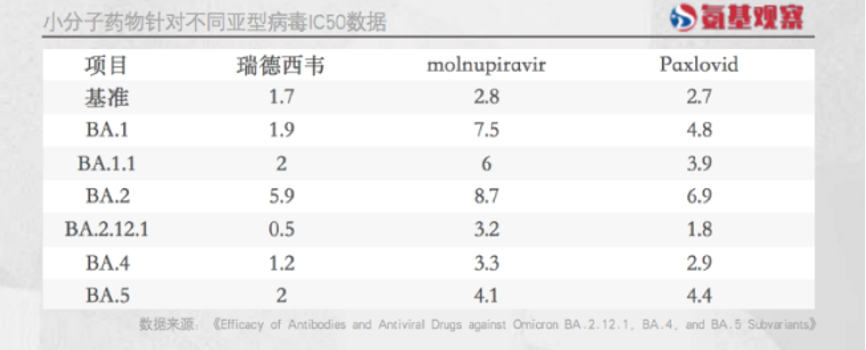 實際上,後續在與奧秘克戎毒株的對壘中,瑞德西韋表現似乎更勝一籌。如下圖所示,根據體外測試IC50數據,針對多個奧秘克戎毒株,瑞德西韋活性受到的影響最小。
