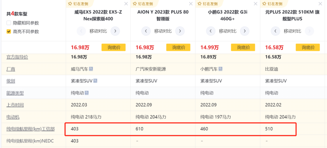 與對標車型小鵬G3、埃安Y、比亞迪元EV PLUS相比,威馬EX5的續航里程是最小的。在輔助駕駛、車載智能系統、車載智能芯片的智能化角度上,相比其他三家,也存在感很弱。作為一款必須要與傳統燃油車拉開差距的純電車,這樣的配置讓消費者也“沒得選”。
