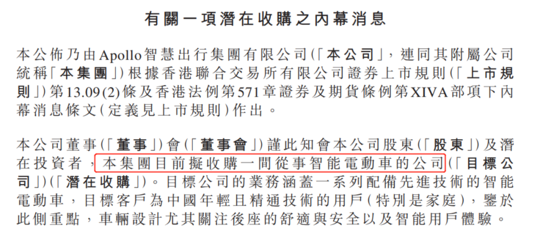 12月5日, Apollo出行披露了《有關一項潛在收購之內幕消息》的公告。公告顯示,Apollo出行目前擬收購一家從事智能電動車的公司。目標公司的業務涵蓋一系列配備先進技術的智能電動車。