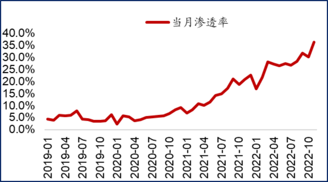 然而經過幾年的發展,威馬用銷量證明了,它造車並沒有蔚小理靠譜。疊加上個階段,市場對新能源車企的增長預期主要是替代傳統燃油車的邏輯。隨着2022年中國汽車滲透率的快速增長(見下圖),新能源汽車後續市場增長的倍率被迅速拉低。