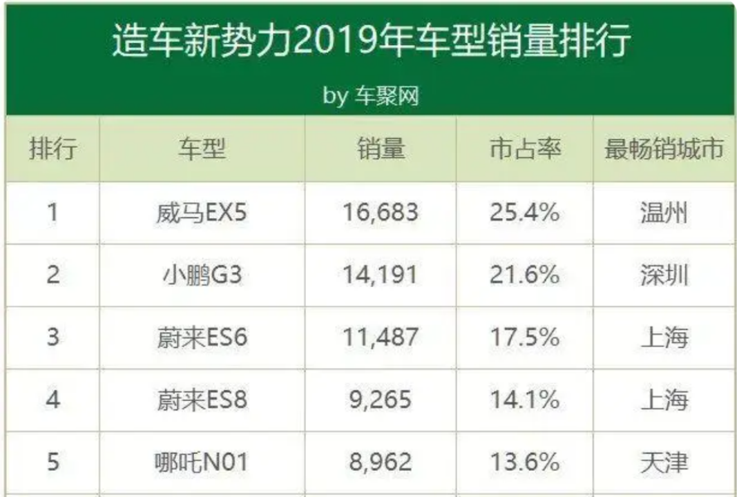 與小鵬一樣,威馬在初期的產品市場視野放在了B端。威馬建立了大雁出行APP作為網約車品牌,期望藉助B端滲透的方式,讓網約車司機和乘客體驗到產品魅力。2019年,威馬EX5單車銷量達到16883輛,拉開其他新勢力一大截。