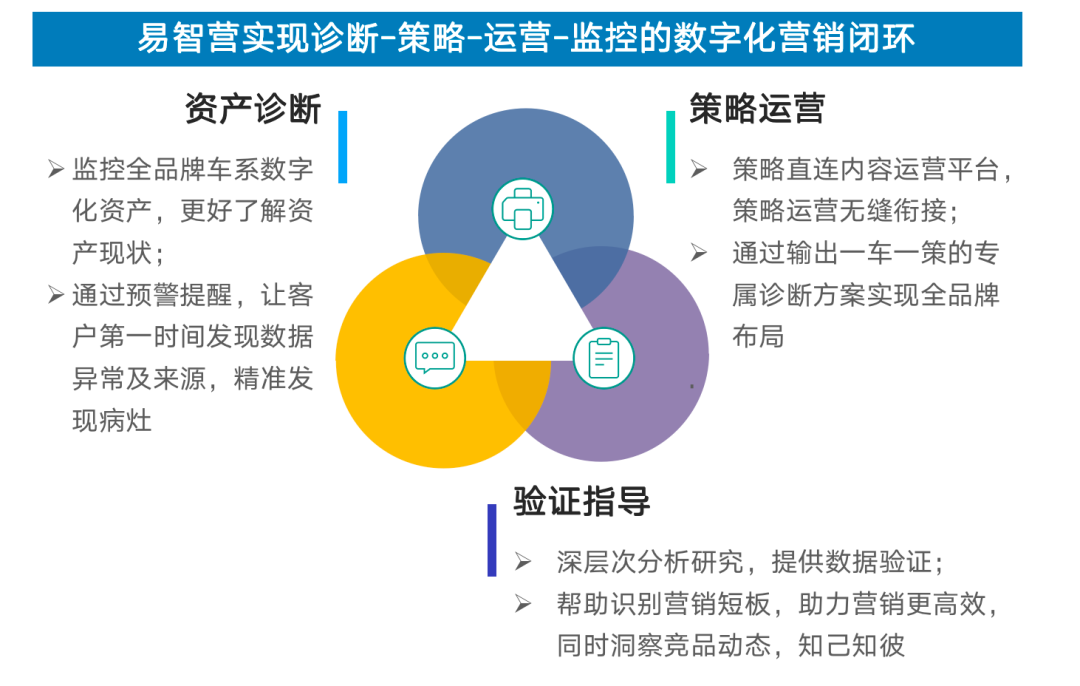 以影響體系易智營為例,作為易車推出的車企營銷資產智慧管家,易智營通過數據可視化建立“診斷-施策-運營-評估”營銷閉環,實現營銷的數字化管理和實施,最終實現數據決策、科學管理、智能經營。