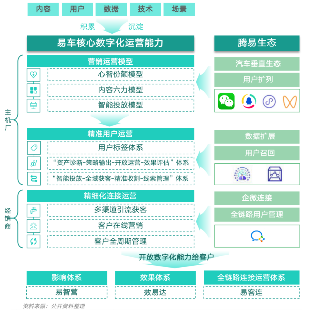 這些年隨着跟騰訊的合作邁入深水區,基於多年來在內容、用户、技術、數據、場景方面的運營經驗和積累,易車沉澱出核心數字化營銷運營能力,並在騰易生態加持下,形成助力車企和經銷商等客户的三大營銷價值體系,打造了營銷運營化的易車方案——易車智效引擎。