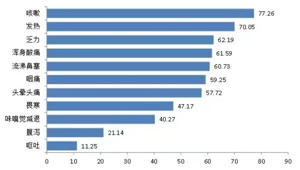 同時,調查還對新冠感染臨牀症狀發生率作出公佈,並根據問卷得出“咳嗽發生率為77.26%”、“從年齡分佈來看,12歲以下兒童咳嗽多在5天以內,大部分在3-10天間,65歲以上老年人咳嗽超過10天的比例略高”、“38.62%的患者病程超過5天”等統計數據。