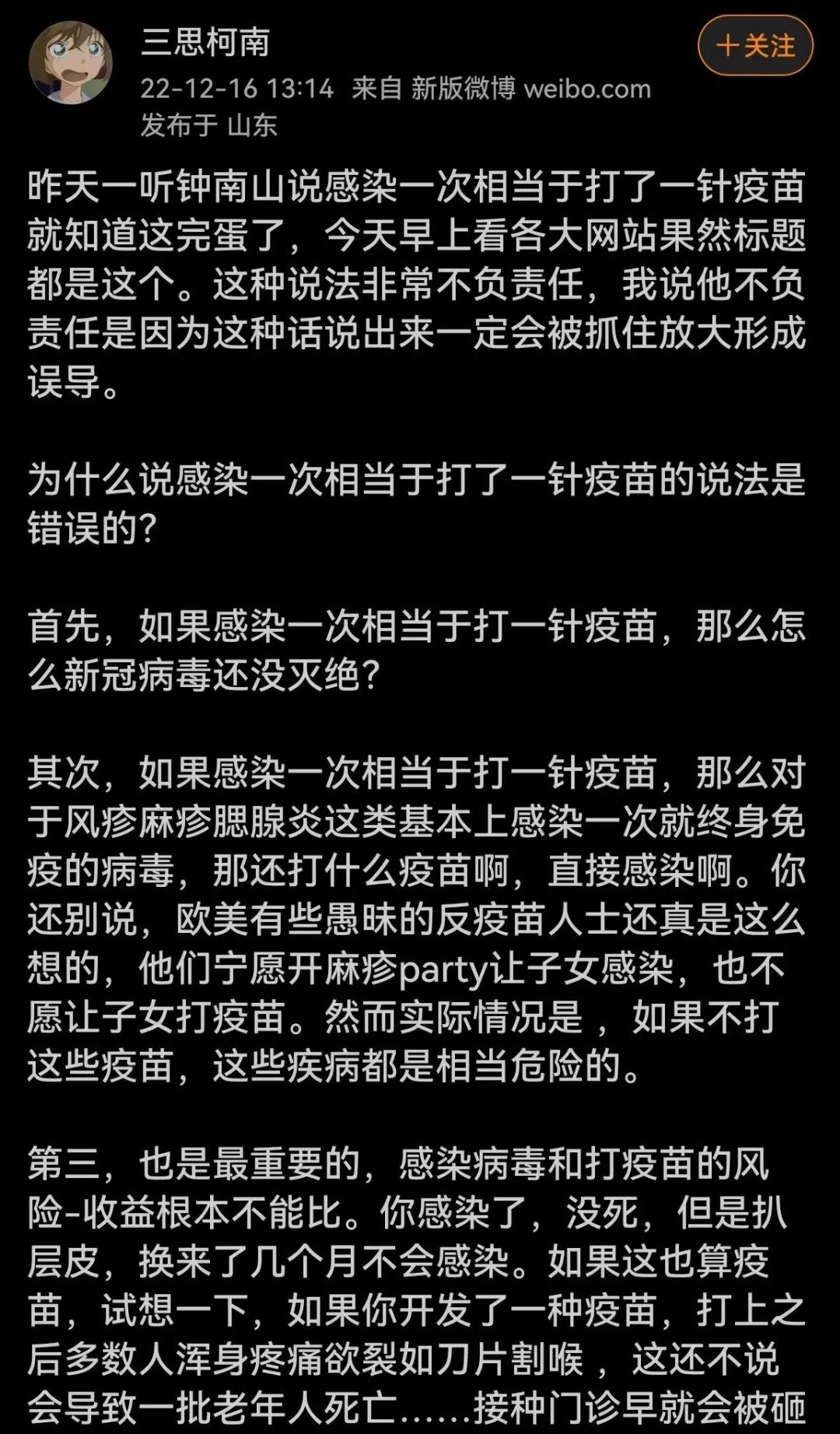 所以,鍾院士的講座實際很全面,並非只強調所謂“感染一次相當於打一針疫苗”,三思柯南如果沒有了解講座全貌,就衝着媒體拿來做標題黨的這句話去批評鍾院士,這根本就不是科學的嚴謹態度。