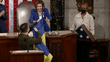 ▲2022年12月,烏克蘭總統澤連斯基在美國國會發表講話期間,將由烏克蘭士兵簽名的烏克蘭國旗交給美國眾議院議長佩洛西,並與其行貼面禮。