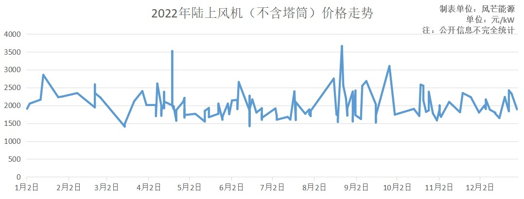 2022年一季度,整機價格一路下跌,陸上風機最低中標價格1408元/kW。二、三季度,整機價格趨穩,三北地區6MW以上風機基本穩定在1400-1700元/kW。10月,陸上風機含塔筒中標價格1582元/kW刷行業新低。減去塔筒價格,陸上風機價格下探至1200元/kW。海上風電也因陸上風機殺入、市場競爭白熱化,價格屢刷新低,現最低含塔筒3282元/kW。