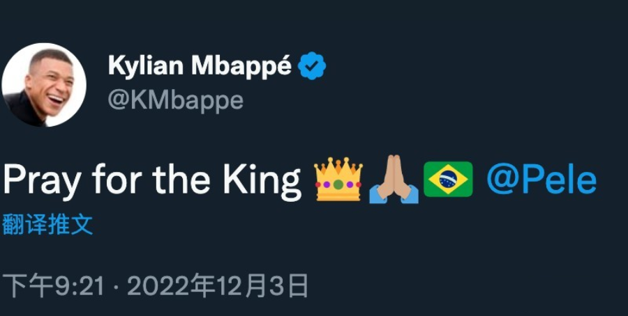 法國國腳基利安·姆巴佩也在社交媒體寫道“為球王祈禱”