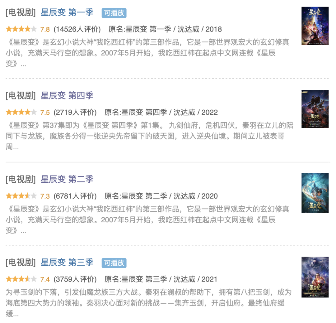 2022年初,《星辰變第四季》迴歸。既往幾季曾為《星辰變》打下紮實的用户口碑,這部續作也不露疲態,延續了豆瓣評分7分以上的系列傳統。主人公秦羽踏入逆央境,一場精彩的尋寶探險之旅就此開啓,考究的特效與敍事在開播期間收穫了超7000萬的集均播放量。