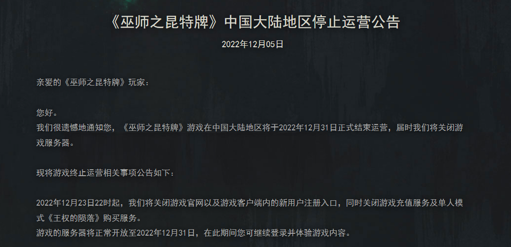 值得一提的是,這些遊戲裏有個《 巫師之昆特牌 》,它 28 號才拿到版號,可就在不久前的 12 月 5 日,官方宣佈 31 號就要關服結束運營。