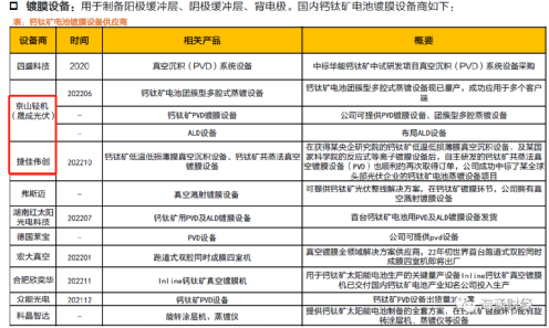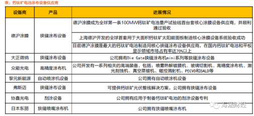 現在中國的鈣鈦礦電池生產企業,跟上游的設備廠商合作非常緊密,捷佳偉創、京山輕機、邁為股份、大族激光這些中國光伏設備廠商能夠出貨鈣鈦礦各個環節的生產設備。