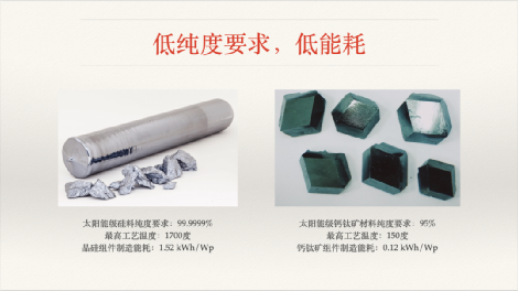 鈣鈦礦組件生產全過程中,工藝温度不超過150℃,單瓦耗能只有0.12度電左右,不到晶硅耗能的1/10。