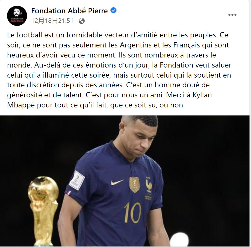 賽後,姆巴佩不僅拒絕了休假的機會,立刻歸隊訓練備賽,而且還偷偷地把世界盃上獲得的工資和獎金全部捐給了慈善機構——Abbé Pierre Foundation。