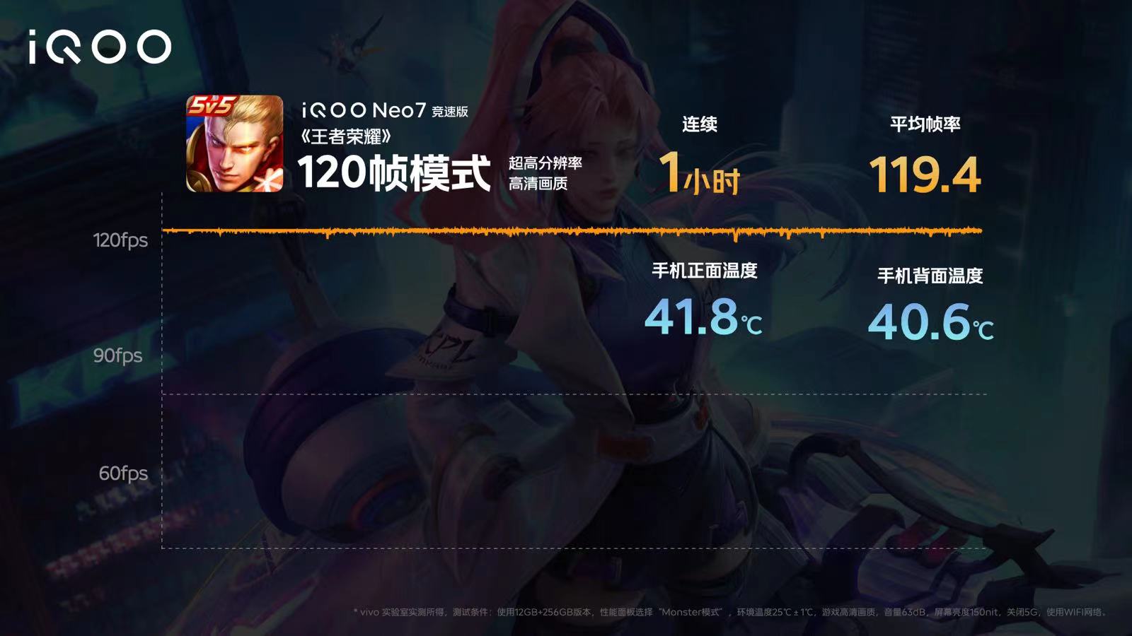 惟有專業調校,方能展現旗艦硬件最強實力。在iQOO的悉心調校之下,iQOO Neo7 競速版的安兔兔跑分高達1,135,786分,位列行業頂尖水準。暢玩1小時《王者榮耀》120幀模式(超高分辨率、高清畫質),Neo7 競速版能夠達到平均幀率119.4的高水準,且機身温控也表現十分優秀。