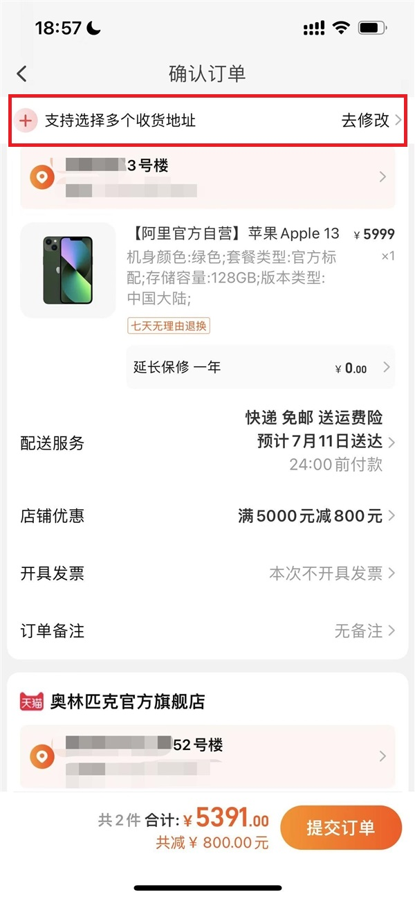 此外,今年 6 月 10 日起,淘寶天貓開始灰度測試 “ 多地址下單 ” 功能,7 月該功能正式上線。