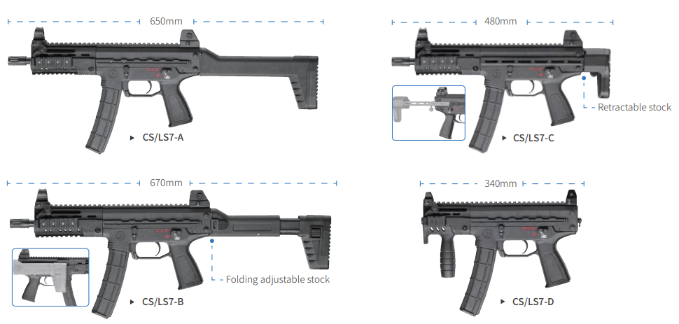 20式槍族中的CS/LS7其實是C型,採用的是伸縮式槍托,此外其實還有A型的固定槍托、B型的摺疊槍托以及D型的無槍托型號。此外,外貿宣傳中還特別説明了CS/LS7可以配備消音器以及彈鼓。