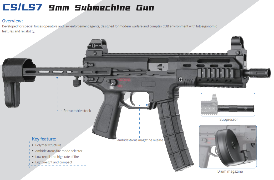 此外,20式槍族中的QCQ171衝鋒槍也在外貿產品之中,這並不奇怪,QCQ171長期以來都是以CS/LS7的外貿代號存在的,在這次的宣傳頁中,還介紹了CS/LS7的ABCD四種型號。