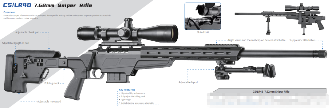 20式狙擊步槍中的三款狙擊步槍也出口了兩款,QBU203式7.62毫米狙擊步槍此前的外貿代號是CS/LR35,此次為了和同樣出口的“26萬”名字配套,改稱CS/LR4B(26萬代號為CS/LR4A)。
