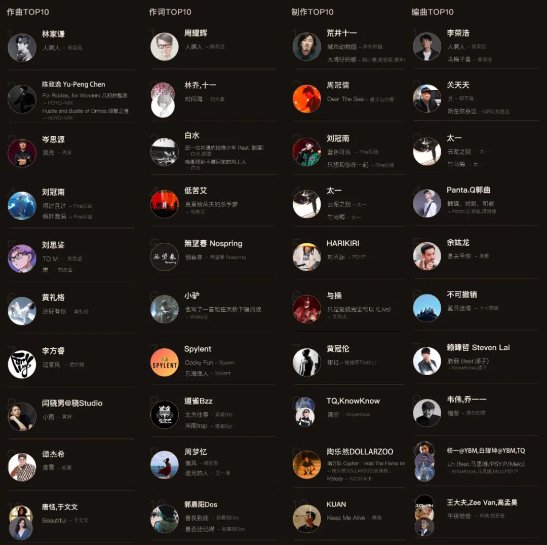 無論風格代際有何差異,這些音樂人在過去一年在作品層面都有着良好的表現。他們中有的人推出了廣受好評的新作品,有的人發佈了獲譽無數的新專輯,有的人在專業獎項中得到了業界專家的認可,有的人通過綜藝節目贏得了更多觀眾的喜愛。
