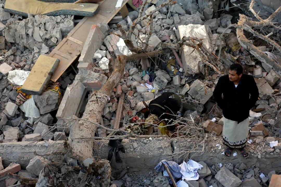 1月18日,在也門首都薩那,一名男子站在空襲過後的廢墟中。
