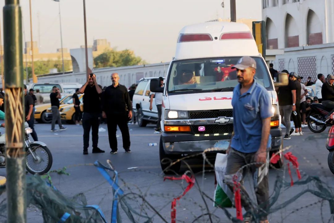 8月29日,在伊拉克首都巴格達,救護車駛入“綠區”。當天在伊首都巴格達“綠區”舉行的抗議活動中出現流血衝突,造成至少12人死亡、數十人受傷。