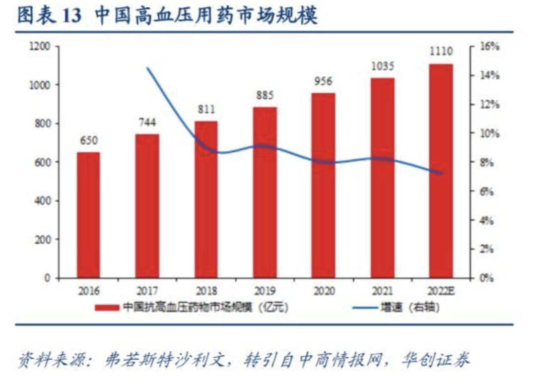 華創證券研報顯示,在我國,高血壓用藥已經形成了一個每年千億級的市場:2021年中國高血壓用藥市場規模達到1035億元,同比增長8%,預計2022年將達到1110億元。