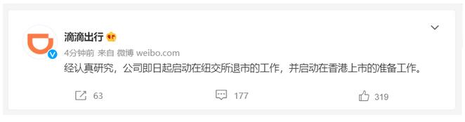 12月3日,@滴滴出行 宣佈,經認真研究,公司即日起啓動在紐交所退市的工作,並啓動在香港上市的準備工作。