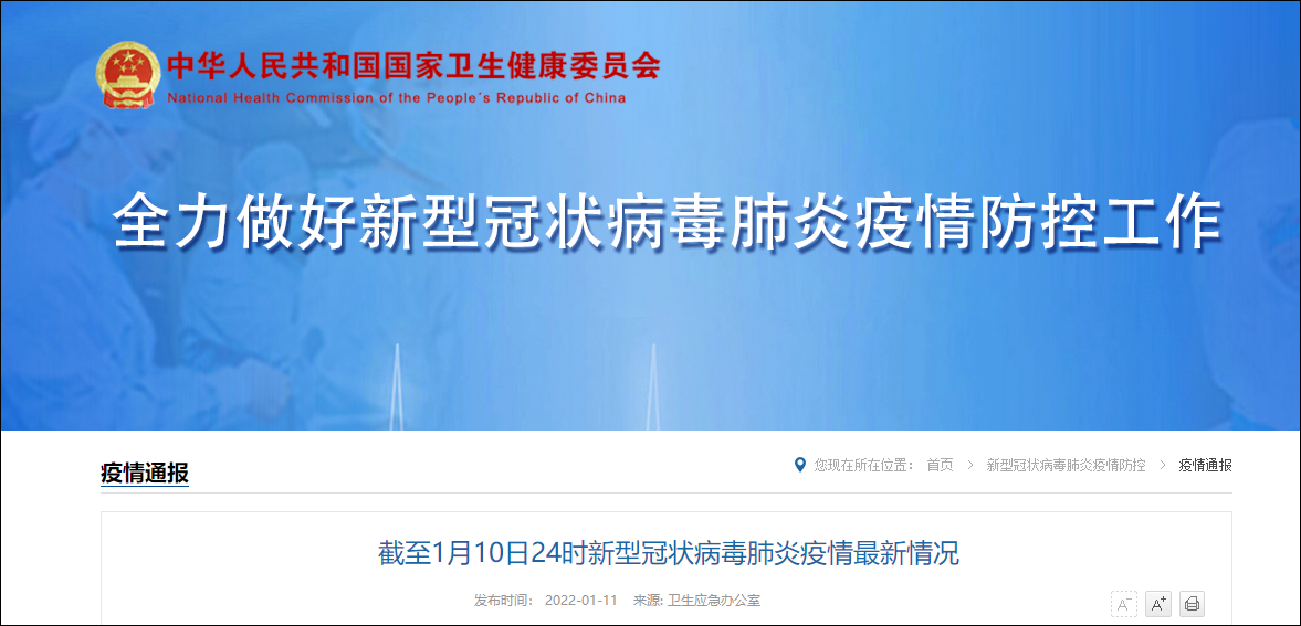 國家衞健委網站1月11日消息,1月10日0—24時,31個省(自治區、直轄市)和新疆生產建設兵團報告新增確診病例192例。其中境外輸入病例82例(上海27例,廣東18例,福建10例,天津8例,浙江7例,廣西5例,四川2例,雲南2例,北京1例,江蘇1例,河南1例),含8例由無症狀感染者轉為確診病例(浙江3例,天津2例,廣東2例,河南1例);本土病例110例(河南87例,其中許昌市74例、鄭州市11例、安陽市2例;陝西13例,均在西安市;天津10例,均在津南區)。無新增死亡病例。無新增疑似病例。