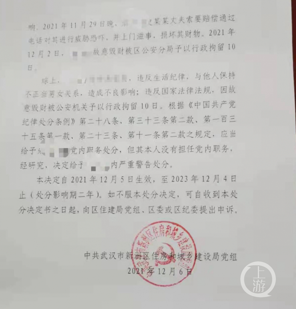 武漢公職人員與他人妻子有染,被單位給予降級和黨內嚴重警告