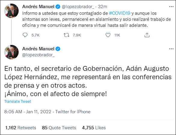 洛佩斯還表示,墨西哥內政部長阿丹·埃爾南德斯(Adán Augusto López Hernández)將代表他出席新聞發佈會及其他活動。