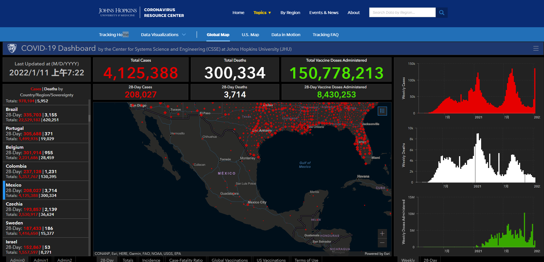 美國約翰斯·霍普金斯大學統計數據顯示,截至北京時間2022年1月11日7時22分,墨西哥新冠肺炎累計確診病例達4125388例,累計死亡病例達300334例。
