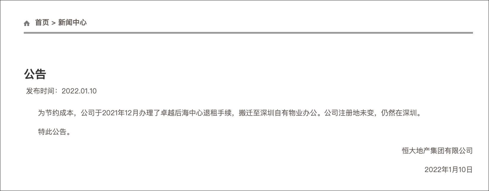 (文/觀察者網李麗 張志峯 編輯/馬友友)對於總部退租、招牌一事,恒大集團1月10日在其官網發佈公告稱,“為節約成本,公司於2021年12月辦理了卓越後海中心退租手續,搬遷至深圳自有物業辦公。公司註冊地未變,仍然在深圳。”