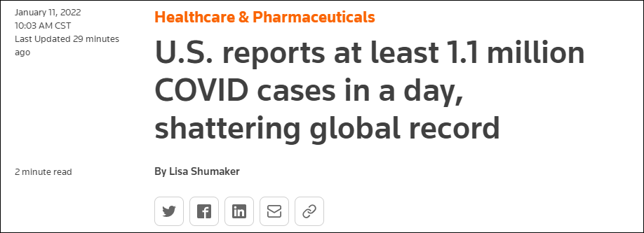 據報道,此前的日新增數紀錄同樣由美國在一週前創下,1月3日(週一),美國新增新冠確診數超百萬例,達103萬例。