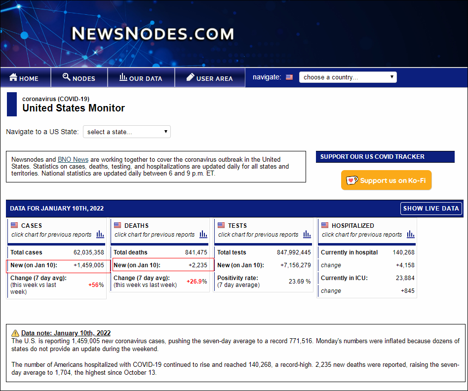 而新聞網站BNONews綜合美國各州數據報道稱,1月10日美國新增新冠確診病例數為1459005例,新增死亡病例數為2235例。