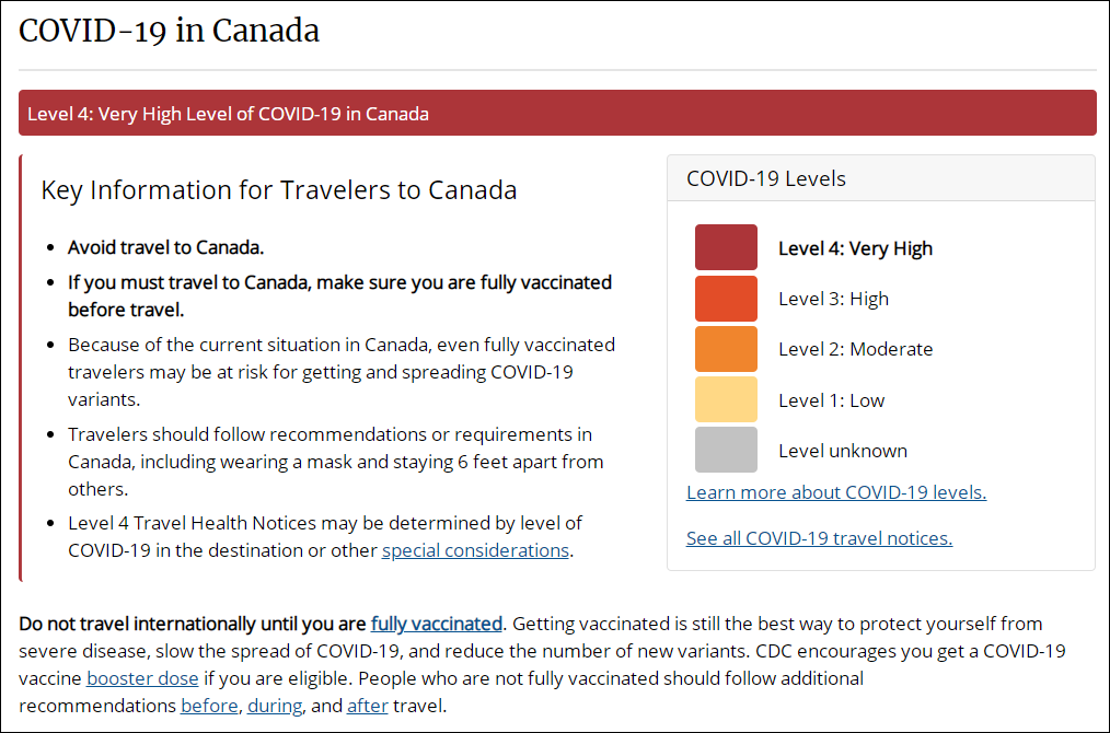 美國CDC稱:“鑑於加拿大目前的新冠疫情,即使是完全接種疫苗的旅行者也有感染和傳播新冠變異株的風險。”