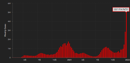 美國約翰斯·霍普金斯大學統計數據顯示,1月3日至9日的一週內,美國新增確診數達496.7萬例,而2021年12月20日至26日新增確診數為139.1萬例。