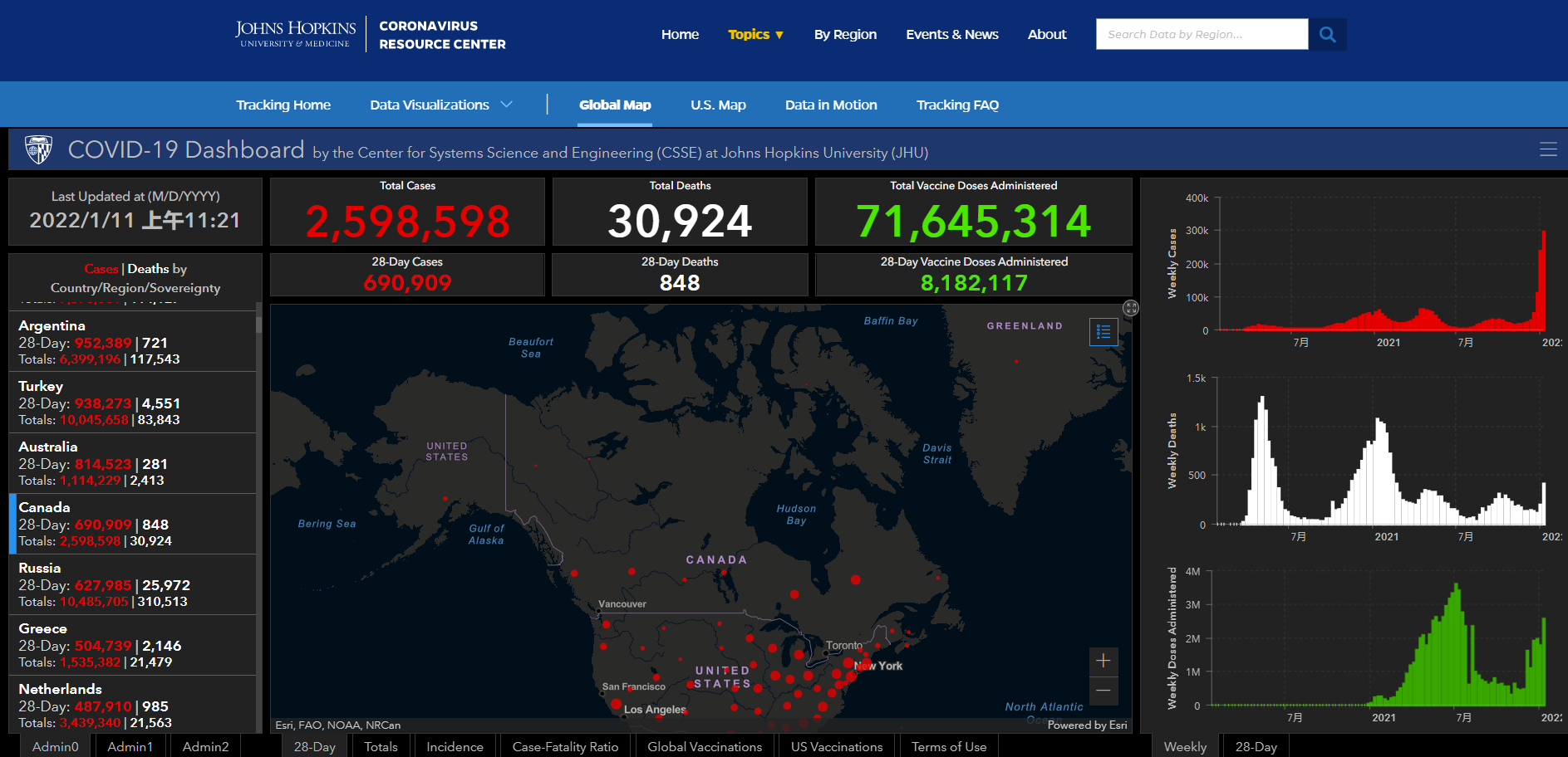 美國約翰斯·霍普金斯大學統計數字顯示,截至北京時間2022年1月11日11時21分,加拿大新冠肺炎累計確診病例達到2598598例,累計死亡病例達到30924例。