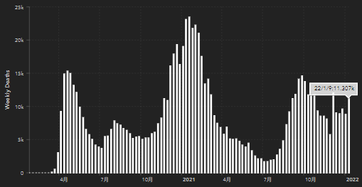 1月3日至9日的一週內,美國新增死亡病例數達11307例,數據來源:美國約翰斯·霍普金斯大學網站