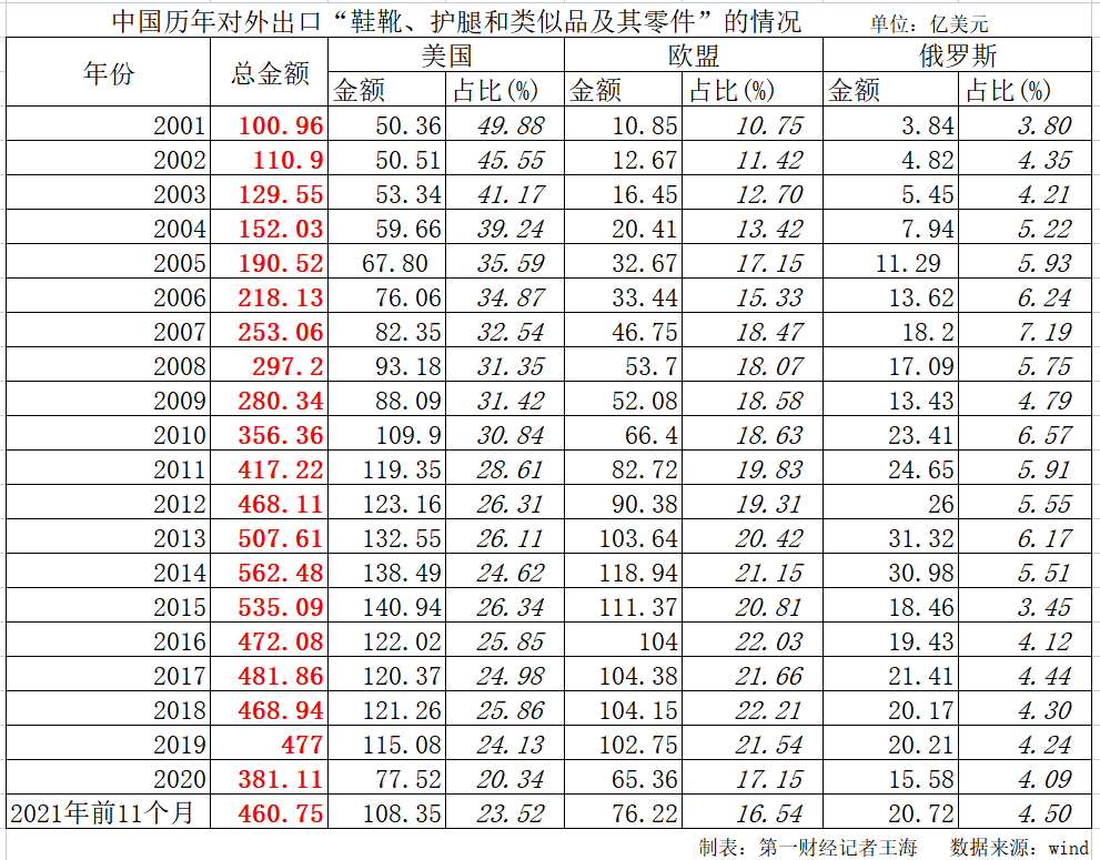 Wind數據顯示,2020年,中國出口到美國、歐盟、俄羅斯的鞋靴、護腿和類似品及其零件的金額分別為77.52億美元、65.36億美元、15.58億美元,佔中國對外出口總額的比例分別為20.34%、17.15%、4.09%。