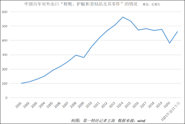 近二十年來,中國每年向全世界出口幾十億雙鞋子。自加入世界貿易組織以來,中國製鞋產業以勞動力優勢為根基,積極參與全球生產分工。中國鞋靴產品的出口金額從2001年的100.96億美元,不斷攀升,直至2014年的562.48億美元。