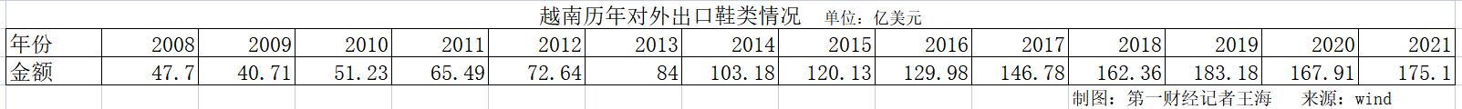 疫情前,越南的製鞋產業出口穩步攀升。Wind數據顯示,該國每年對外出口的鞋類在2010年之前不足50億美元,在2019年則達到183.18億美元,十年翻了三倍多。