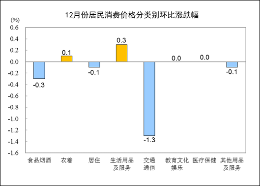 12月份,全國居民消費價格環比下降0.3%。其中,城市下降0.3%,農村下降0.3%;食品價格下降0.6%,非食品價格下降0.2%;消費品價格下降0.4%,服務價格持平。