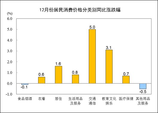 12月份,食品煙酒類價格環比下降0.3%,影響CPI下降約0.09個百分點。食品中,鮮菜價格下降8.3%,影響CPI下降約0.21個百分點;蛋類價格下降1.8%,影響CPI下降約0.01個百分點;鮮果價格上漲3.4%,影響CPI上漲約0.06個百分點;糧食價格上漲0.6%,影響CPI上漲約0.01個百分點;畜肉類價格上漲0.5%,影響CPI上漲約0.02個百分點,其中豬肉價格上漲0.4%,影響CPI上漲約0.01個百分點;水產品價格上漲0.3%,影響CPI上漲約0.01個百分點。