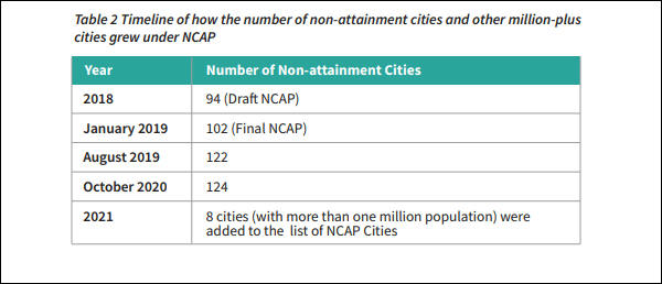 根據能源和清潔空氣研究中心(CREA)的一份報告顯示,在2019 年啓動該計劃時印度全國共有102個城市的空氣質量低於國家標準,然而目前共有132個城市空氣質量低於國家標準。經過3年的治理反而增加了30個空氣質量未達標城市。