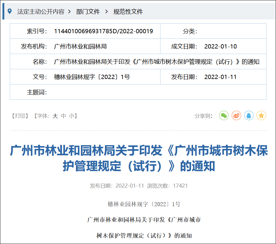 昨日(1月11日),廣州市林業和園林局印發《廣州市城市樹木保護管理規定(試行)》,加碼樹木保護。