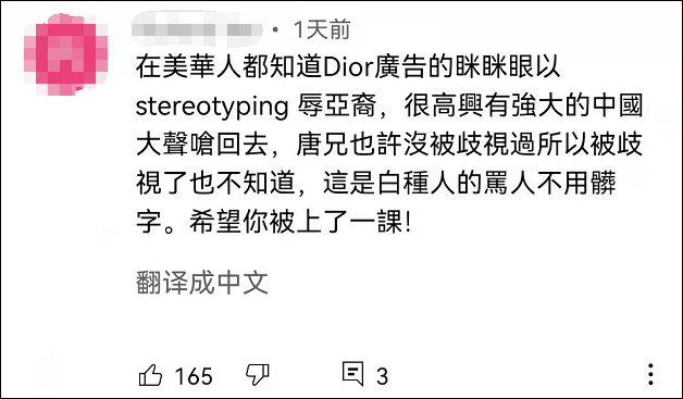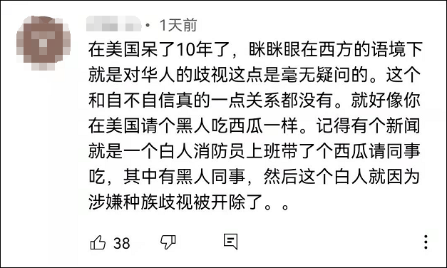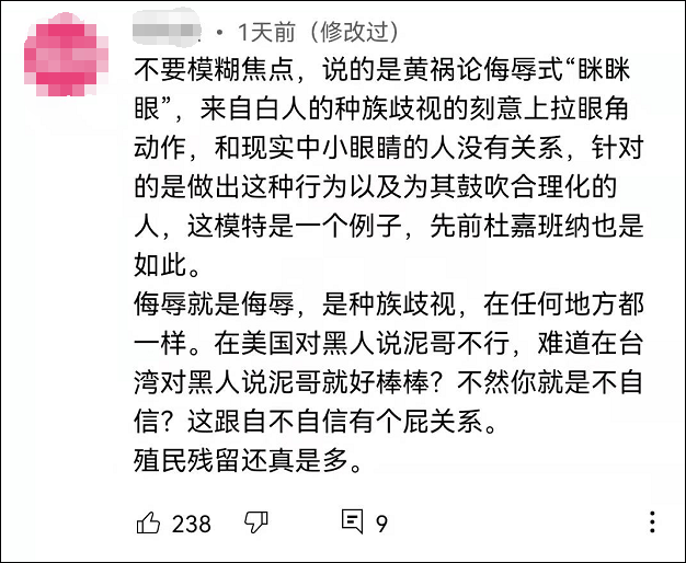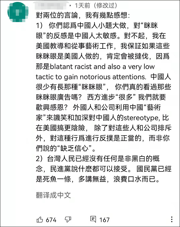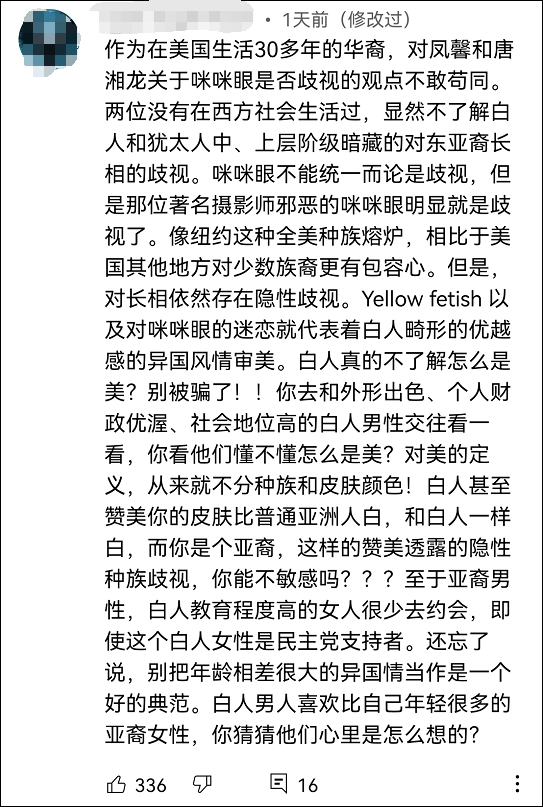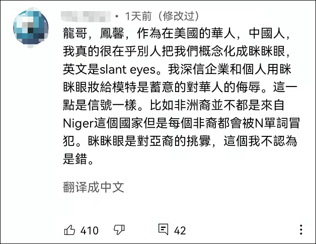 一些在美華人更是直白講明,企業或個人讓模特畫“眯眯眼”妝容就是對華裔長相的歧視與侮辱,大陸的排斥是正當的,而非唐湘龍所謂的“缺乏信心”。他們也會在乎被概念化成“眯眯眼”,因此“很高興有強大的中國大聲嗆回去”。