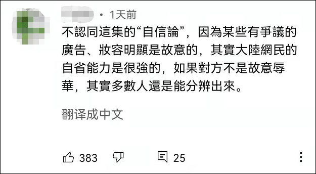 根據節目,大陸網友反對西方審美霸權和刻板印象的行為,首先被這兩人“定性”成所謂的“極端民族主義”,並認為這種情緒會給跟大陸交往的對象造成困擾。