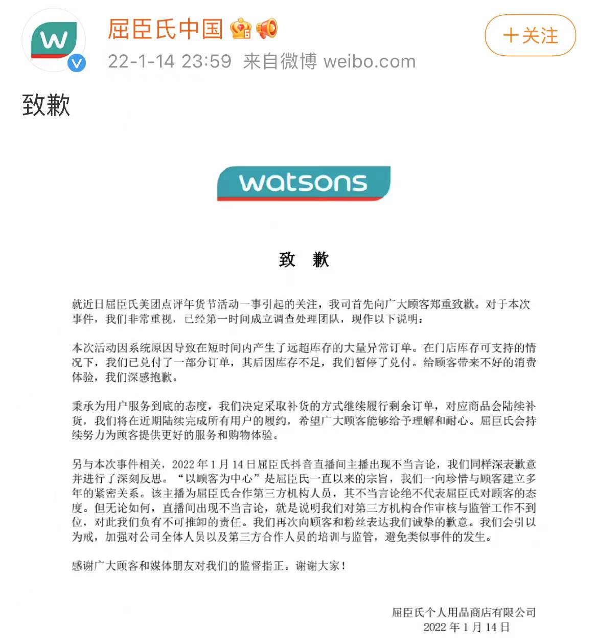 14日深夜,@屈臣氏中國 姍姍來遲發佈致歉聲明,稱將採取補貨的方式履行剩餘訂單。對於直播間主播出現的不當言論,聲明稱該主播系第三方機構人員,屈臣氏將深刻反思並加強對公司全體人員以及第三方合作人員的培訓與監管。